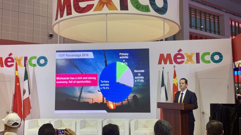 En el marco de la feria internacional “China International Import Expo” que se realiza en Shanghái, Jesús Melgoza Velázquez, secretario de Desarrollo Económico de Michoacán, dictó la conferencia “El binomio de competitividad del puerto de Lázaro Cárdenas, Michoacán y la Zona Económica Especial”, ante más de 100 representantes de empresas de capital chino, que se dieron cita en el pabellón de México del Centro Nacional de Exhibiciones y Convenciones.