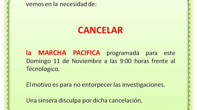 Respecto a los motivos que orillaron a la cancelación de la marcha-caravana, en las redes sociales se lamenta que haya sido presionados para la decisión “porque nadie un poco cuerdo, aceptará que un evento se desactive para no afectar las investigaciones”.