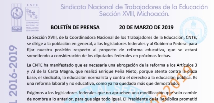 El motivo de esa movilización, anunciada para operar sólo dos días, es que están en contra de la contrarreforma educativa impulsada por su aliado, el hoy presidente de la República, quien les habría fallado porque, aducen, no los tomó en cuenta como se habría pactado pero, fundamentalmente, en el dictamen que debió haberse aprobado ayer con el apoyo de todas las bancadas, a excepción aparente de la del Partido del Trabajo (PT), no aparecen las canonjías ofrecidas, como la devolución del control de plazas y el amparo laboral en el apartado B del artículo 123 constitucional.