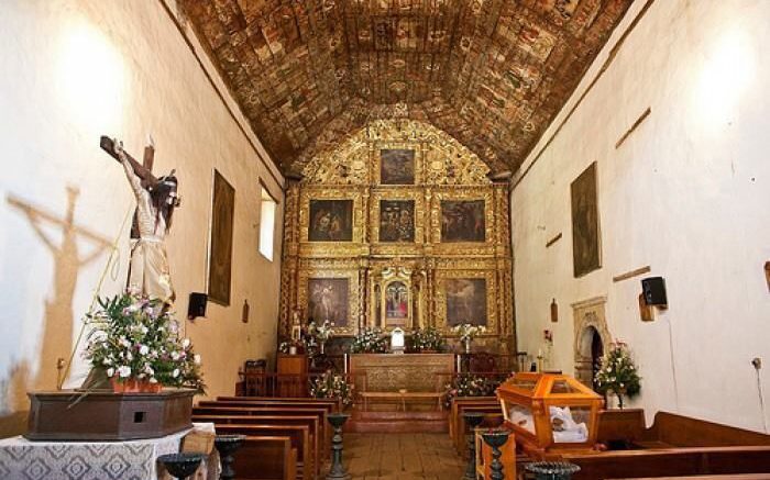 La Capilla de Santiago en Charapan, está pintada con los apóstoles como protagonistas de la bóveda de madera.
