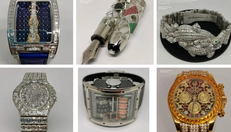 En la conferencia mañanera, explicó que relojes (algunos con diamantes incrustados), plumas, anillos, pulseras y otros elementos de joyería incautados estarán exhibidos en la semana del 21 al 28 de julio en uno de los salones de los Pinos, y el último día se subastarán.