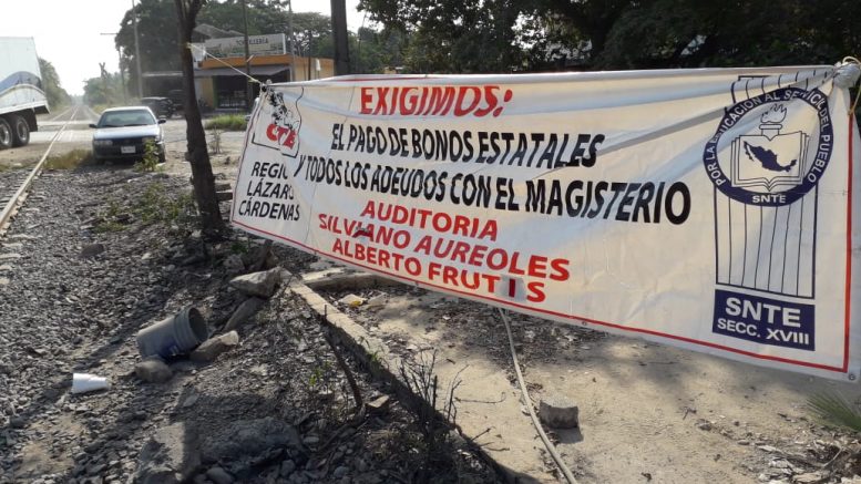 Lázaro Cárdenas, Michoacán.- De 8 a 14 horas, maestros de la CNTE bloquearon las vías del tren a su paso por Las Guacamayas, sobre la avenida Morelos, exigiendo pago de todos los rezagos y que se les cubra la primera parte de aguinaldo.