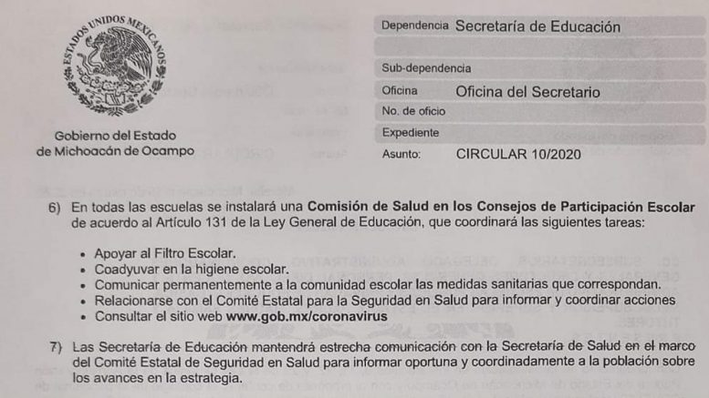 Lázaro Cárdenas, Michoacán.- Un oficio girado por la Secretaría de Educación en el Estado (SEE), establece que además del periodo de suspensión de clases, se tendrán que reforzar las actividades preventivas al Covid-19 o coronavirus, integrando en cada plantel educativo instalando una comisión de salud.