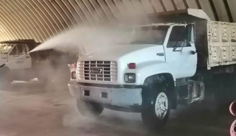 Fue así que este jueves, se sanitizaron de nueva cuenta las instalaciones del Palacio Municipal, así las unidades para el transporte del personal y maquinaria pesada.
