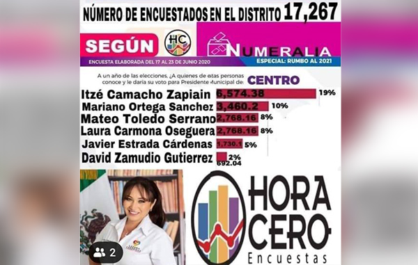 Según esta “encuesta” que HC desconoce totalmente, la edil cuenta con el 19 por ciento de las preferencias en un trabajo que, asegura, se llevó a cabo del 17 al 23 de junio de 2020.