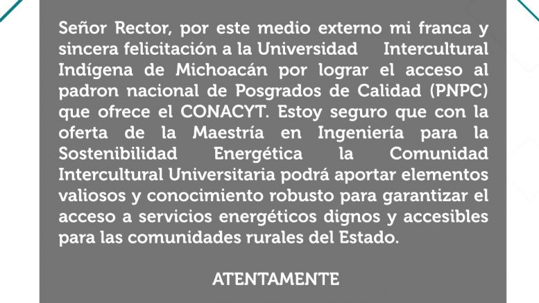 Morelia, Michoacán.- La Universidad Intercultural Indígena de Michoacán (UIIM) logró el acceso al padrón nacional de Posgrados de Calidad que ofrece el CONACYT, con la Maestría en Ingeniería para la Sostenibilidad Energética.