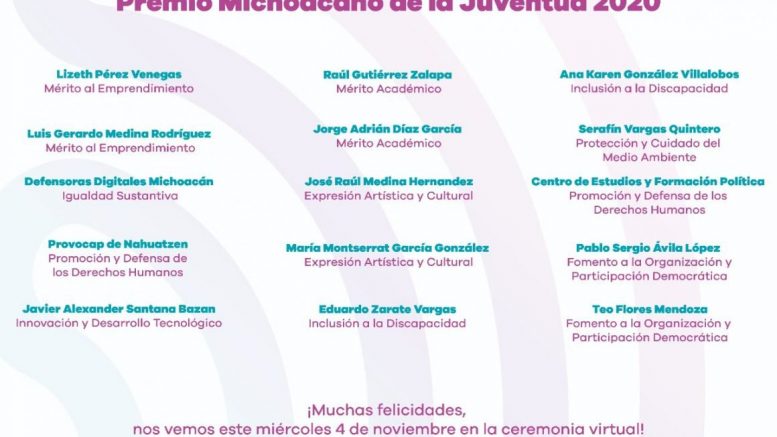 Morelia, Michoacán.- El Instituto de la Juventud Michoacana (Ijumich) dio a conocer la lista de galardonados del Premio Michoacano de la Juventud 2020, tras ser elegidos de entre más de 180 registros de 93 municipios michoacanos.