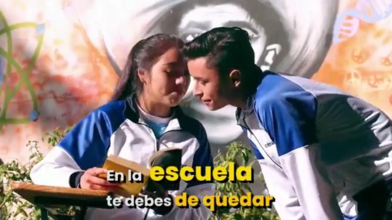 “En la escuela te debes quedar, no te detengas no oh oh… si te propones lo puedes lograr, quédate en la escuela” es otra de las frases que se combina con algunas imágenes de estudiantes alentadoras, con las que se pretende invitar a la comunidad estudiantil a seguir adelante con su preparación académica.