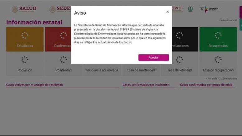 Morelia, Michoacán.- La Secretaría de Salud de Michoacán (SSM), informa que derivado de una falla presentada en la plataforma federal Sistema de Vigilancia Epidemiológica de Enfermedades Respiratorias, (SISVER) se ha visto retrasada la publicación de la totalidad de los resultados de casos positivos de COVID-19 en la entidad.
