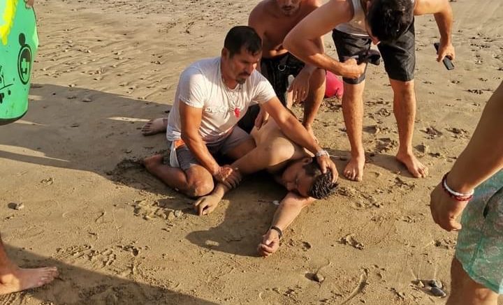 Lázaro Cárdenas, Michoacán.- Salvavidas incorporado a la Dirección de Protección Civil Municipal (PCM) lograron rescatar con vida a un bañista originario del estado de Guanajuato, el cual fue arrastrado por la corriente.