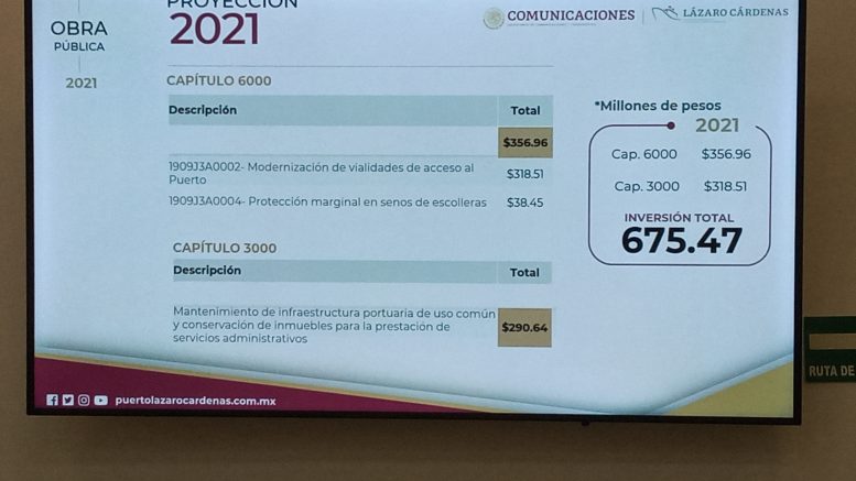 Lázaro Cárdenas, Michoacán.- De las inversiones propias para mantenimiento y mejora de la infraestructura del Puerto, la Administración Portuaria Integral de Lázaro Cárdenas (Apilac) aplicará recursos por el orden de los 675.47 millones de pesos para el presente año 2021.