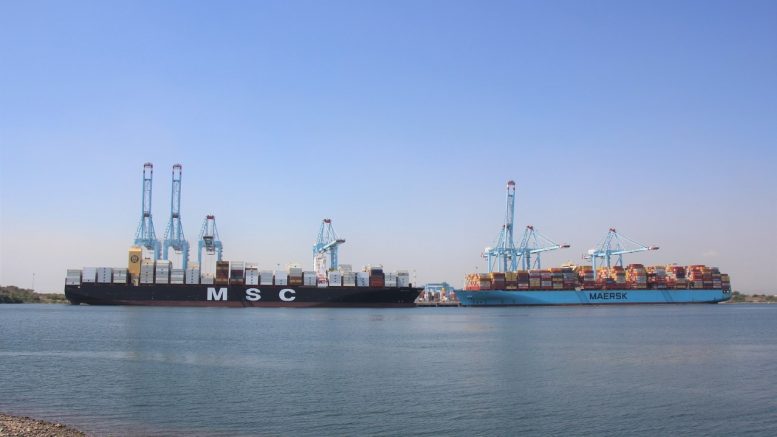 Lázaro Cárdenas, Michoacán.- El Puerto de Lázaro Cárdenas, recibió a dos buques de carga contenerizada de grandes dimensiones, el Maerks Essen de bandera danesa y el MSC Aliya con bandera de Liberia, ambos de 366 metros de eslora y 48 metros de manga, que fueron atendidos en la Terminal Especializada de Contendores II, de este recinto portuario.