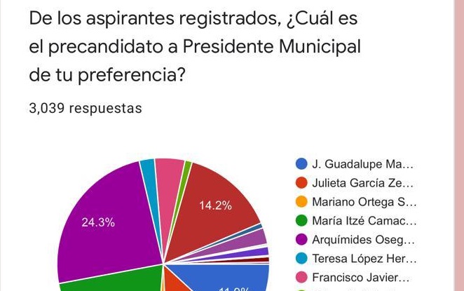 Como resultado del sondeo de opinión se demostró que el aspirante con mayor cantidad de votos fue el exdiputado Arquímides Oseguera, con un total de 24.3%. En segundo lugar aparece la actual edil Itzé Camacho, con 20.4%. En tercer lugar aparece la exdiputada Judith Silva, quien es parte del Movimiento Nacional por la Esperanza y cercana colaboradora de la Lic. Nalleli Pedraza.