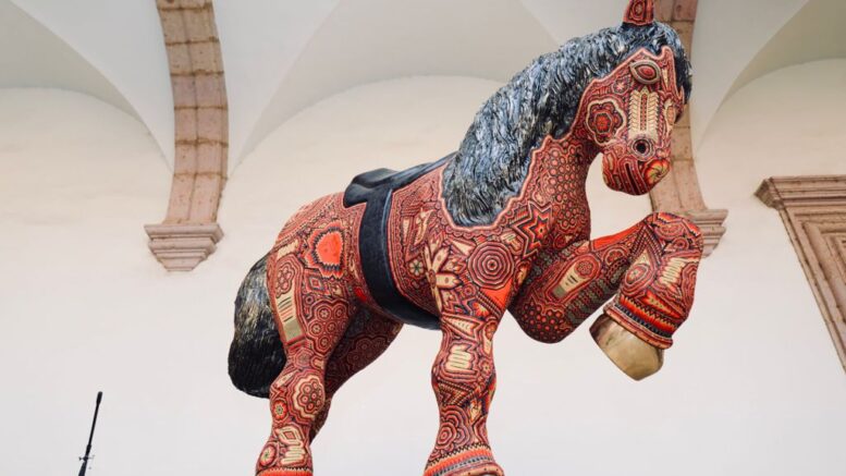 Morelia, Michoacán.- Por seis semanas, la mágica y mística exposición de Arte Huichol del artista César Menchaca se muestra por primera vez en Morelia, albergada en el Centro Cultural Clavijero.