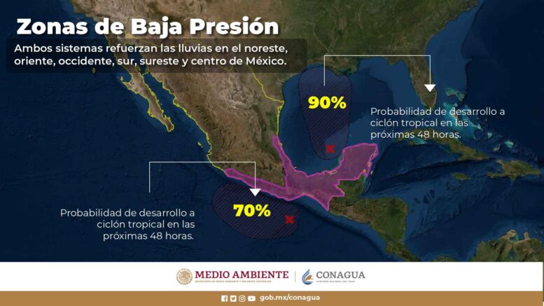 Las condiciones descritas serán generadas por dos zonas de baja presión con alta probabilidad de desarrollo ciclónico; la primera se desplazará sobre el centro del Golfo de México, reforzando las lluvias en zonas del noreste, oriente y sureste de México, y la segunda en el Océano Pacífico, con desplazamiento al sur de las costas de Guerrero, influirá en el estado del tiempo del occidente, sur y centro del territorio nacional, además de un canal de baja presión que prevalecerá en el noroeste del país.