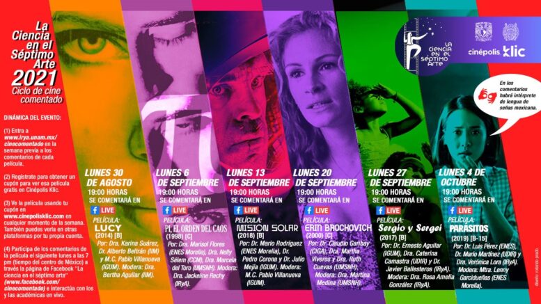 Morelia, Michoacán.- El Ciclo de Cine Comentado “La Ciencia en el Séptimo Arte 2021” este año ofrece la posibilidad de que el público vea las películas a distancia de manera gratuita a través de la plataforma de Cinepolis Klic, y posteriormente se una a las transmisiones en vivo de los comentarios, anunció el comité organizador integrado por académicos de la Universidad Nacional Autónoma de México, Campus Morelia y de la Universidad Michoacana de San Nicolás de Hidalgo (UMSNH).