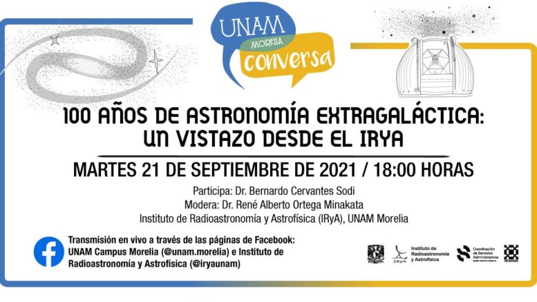 Morelia, Michoacán.- El próximo 21 de septiembre, a las 18:00 horas, el programa de charlas de divulgación a distancia “UNAM Morelia Conversa”, presenta la plática: “100 años de Astronomía Extragaláctica: un vistazo desde el IRyA”, a cargo del Dr. Bernardo Cervantes Sodi, investigador del Instituto de Radioastronomía y Astrofísica (IRyA), de la UNAM Campus Morelia.