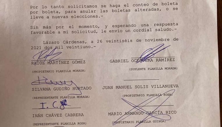 Ante lo expuesto, sostienen exigencia de que se realice conteo boleta por boleta, para retirar del conteo las alteradas, o bien se repongan las elecciones del pasado domingo.