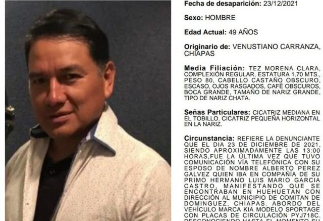 En un comunicado alertaron que el también médico y empresario y autor del libro “La Piel de fuego”, salió del municipio de Huehuetán aproximadamente a las 23:00 horas del 23 de diciembre hacia la ciudad de Comitán de Domínguez, en la ruta de la Sierra Mariscal.