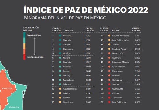 En este índice de resultados se expone Michoacán es evaluado como uno de los estados “menos pacíficos”, al ocupar la posición número 25, donde la entidad número 1, es Yucatán, es decir la más pacífica, mientras que el estado número 32, en 2021, fue Baja California, al registrar la violencia.