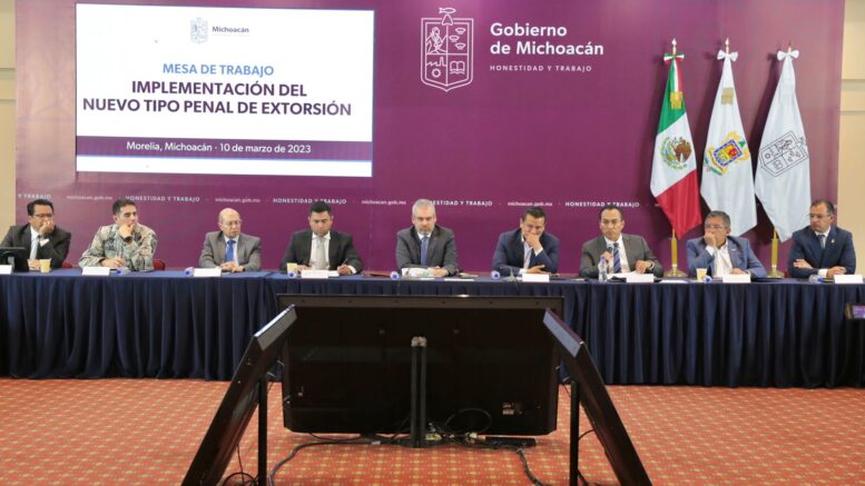 Morelia, Michoacán.- Como parte de las acciones de coordinación institucional para la implementación del nuevo tipo penal de extorsión, el Gobierno de Michoacán e instancias de seguridad y justicia presentaron estrategias operativas para combatir y reducir la incidencia delictiva en la entidad.