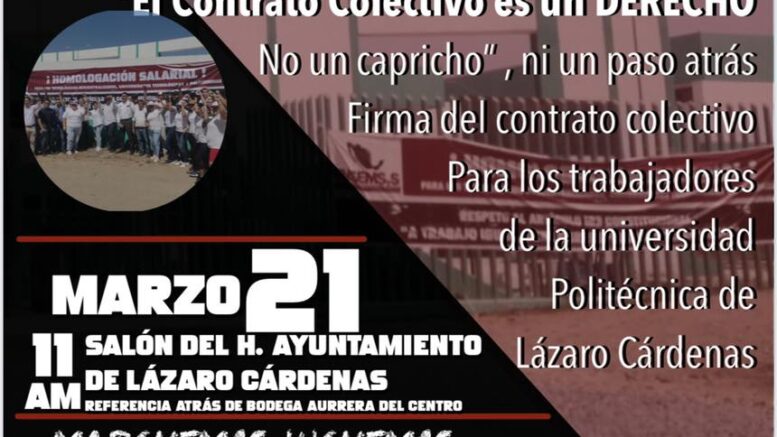 Lázaro Cárdenas, Michoacán.- Una veintena de sindicatos de Michoacán, encabezados por la Coalición Estatal de Sindicatos y Trabajadores de la Educación Superior (CESTES), realizará en esta ciudad un foro a favor de los huelguistas de la Universidad Politécnica de Lázaro Cárdenas, que llevan un mes y 10 días en movimiento, demandando contacto colectivo de trabajo y tabulador salarial.
