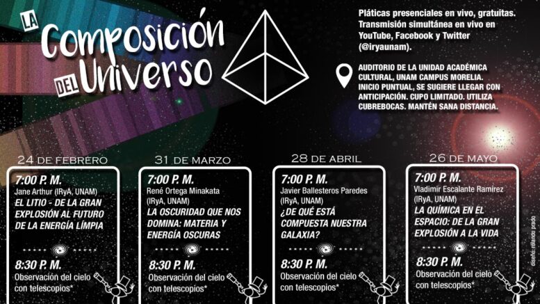 La sesión inicia a las 7:00 pm con la plática en el auditorio principal de la UNAM Campus Morelia, ubicado en la Antigua Carretera a Pátzcuaro No. 8701, Col. Ex Hacienda de San José de la Huerta, enfrente a la Tenencia Morelos. El Dr. René Ortega Minakata compartirá la plática “La oscuridad que nos domina: materia y energía oscuras”.