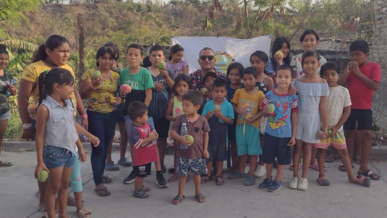 Lázaro Cárdenas, Michoacán.- No solo juguetes recibieron los niños de la colonia Flores Celestes, en Las Guacamayas, sino también mangos, aguinaldos, pastel y mucha agua.