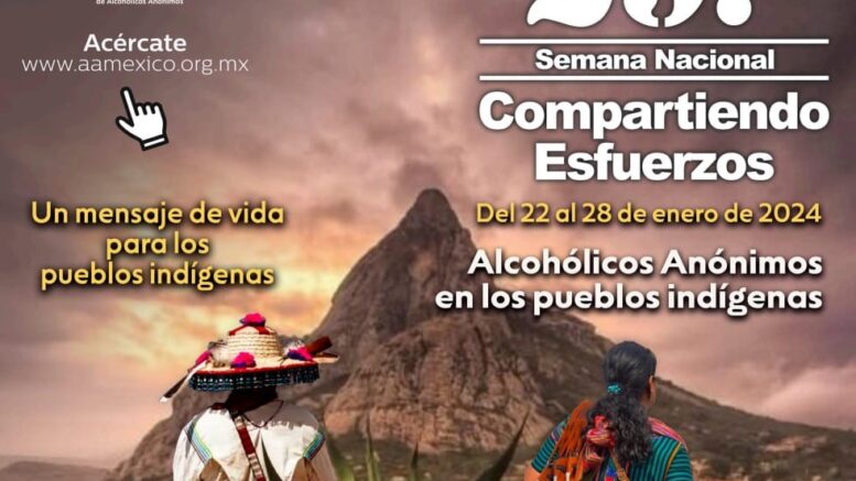 Alcohólicos Anónimos, a través de sus Comités de Información Pública, Centros de Servicio del Distrito 2, 9 y 12, en colaboración con instituciones públicas; organiza del 22 al 28 de enero, la 29ª Semana Nacional de Información “Compartiendo Esfuerzos” con el tema: “Un mensaje de vida para los pueblos indígenas”.