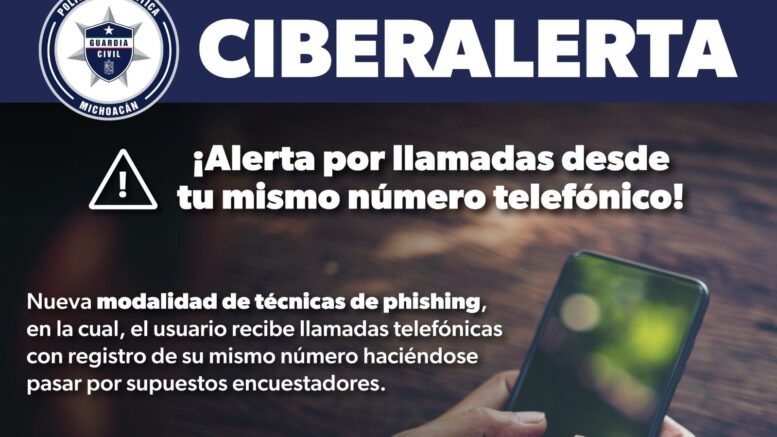 Morelia, Michoacán.- La Secretaría de Seguridad Pública (SSP), a través de la Subdirección de Policía Cibernética, alerta a usuarios de telefonía móvil sobre una nueva modalidad de suplantación de identidad o phishing, donde pueden recibir llamadas registradas como su mismo número, haciéndose pasar por supuestos encuestadores y solicitando información personal.