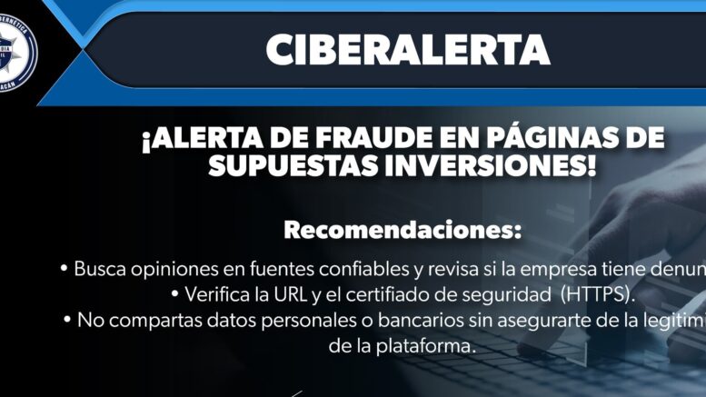 Morelia, Michoacán.- En la actualidad existen múltiples formas de ser víctimas de ciberdelitos que ponen en riesgo el patrimonio propio y familiar, por ello, la Secretaría de Seguridad Pública (SSP) emite la siguiente alerta para prevenir ilícitos financieros.