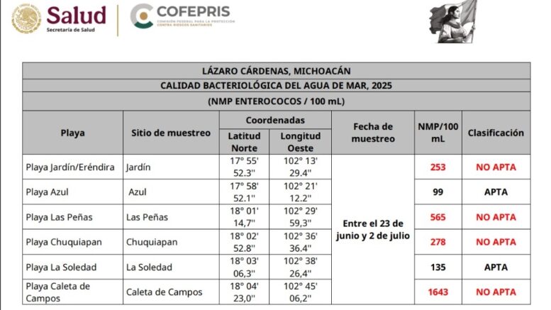 Lázaro Cárdenas, Michoacán.- Si bien la plataforma nacional de Coepris, en su reporte “Monitoreo prevacacional Verano 2025” incluye la información sobre los resultados de los análisis a las tomas de agua marina en las playas más visitadas del país, y ahí se consigna que 17 playas del país, la mayoría de ellas en Michoacán, “no son aptas”, las autoridades de salud se dijeron “fuera de lugar”.